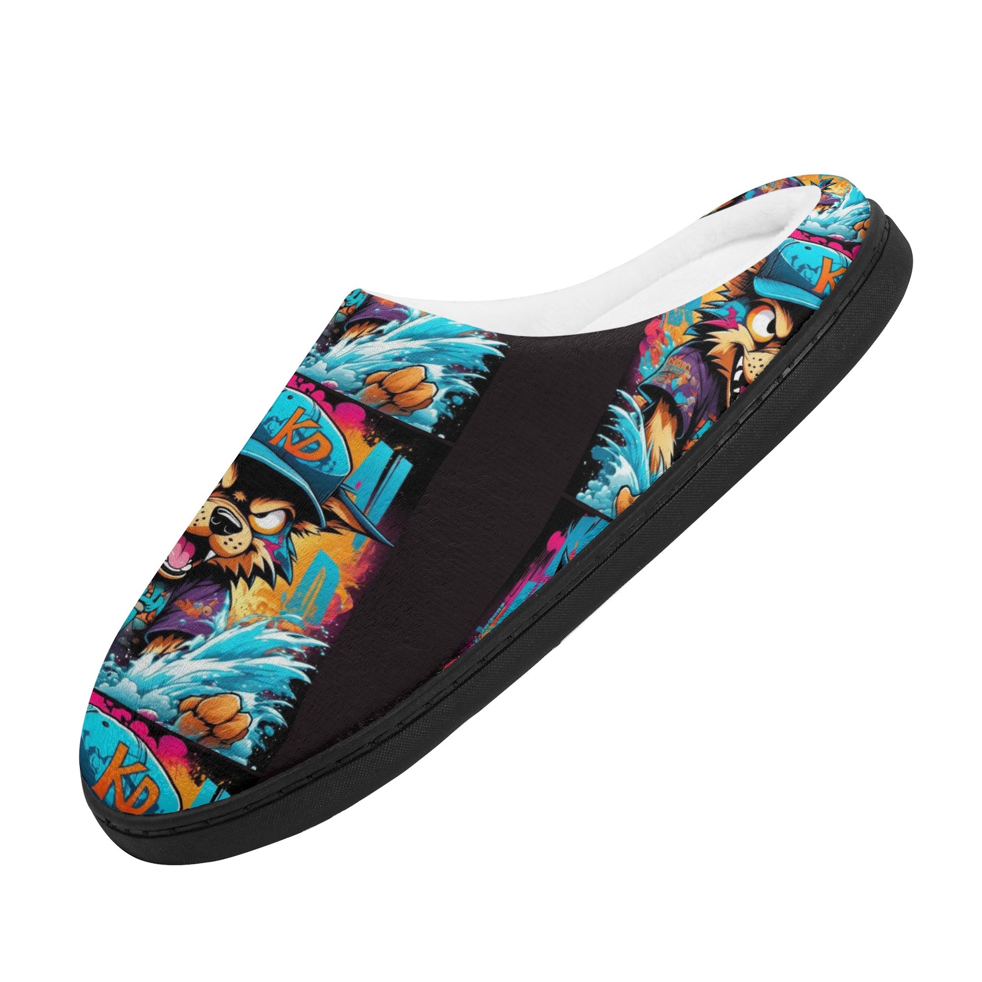 * Custom all over printed slippers with rounded, closed toe and flat heel style construction.